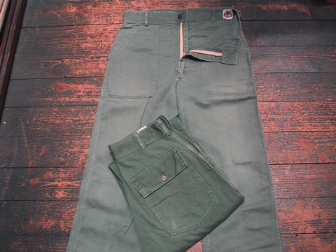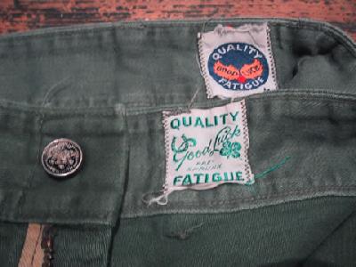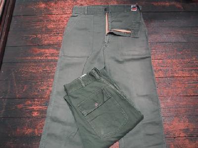 ローカルメイドのファティーグパンツです。いい雰囲気の GOOD LUCK Quality Fatigue のタグがついています。フロントジップは SERVAL です。