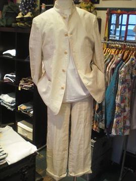 リネンのセットアップスーツです。 素材はリネン100% 薄手のリネンなのでごわつきはなく着心地もよいです。 ジャケットはスタンドカラー パンツは細身のストレート 大人です! プライスは、セットアップで¥9800+taxとなります。